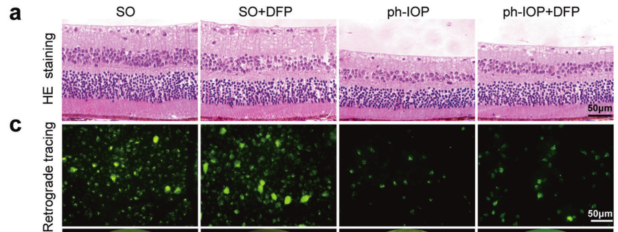 H&E染色結(jié)果顯示,Ph-IOP損傷導(dǎo)致顯著的RGC丟失和視功能損害;接著從形態(tài)學(xué)和功能上驗(yàn)證了DFP對RGC的藥理作用,在 ph-IOP 損傷后5天,DFP處理減弱了神經(jīng)節(jié)細(xì)胞復(fù)合體(GCC)厚度,并增加了RGC數(shù)量(FG標(biāo)記RGC形態(tài))。這些結(jié)果表明,DFP在ph-IOP損傷后保護(hù) RGC 損傷,因此使用DFP抑制鐵死亡是治療ph-IOP誘導(dǎo)的RGC 損失的有效治療策略。