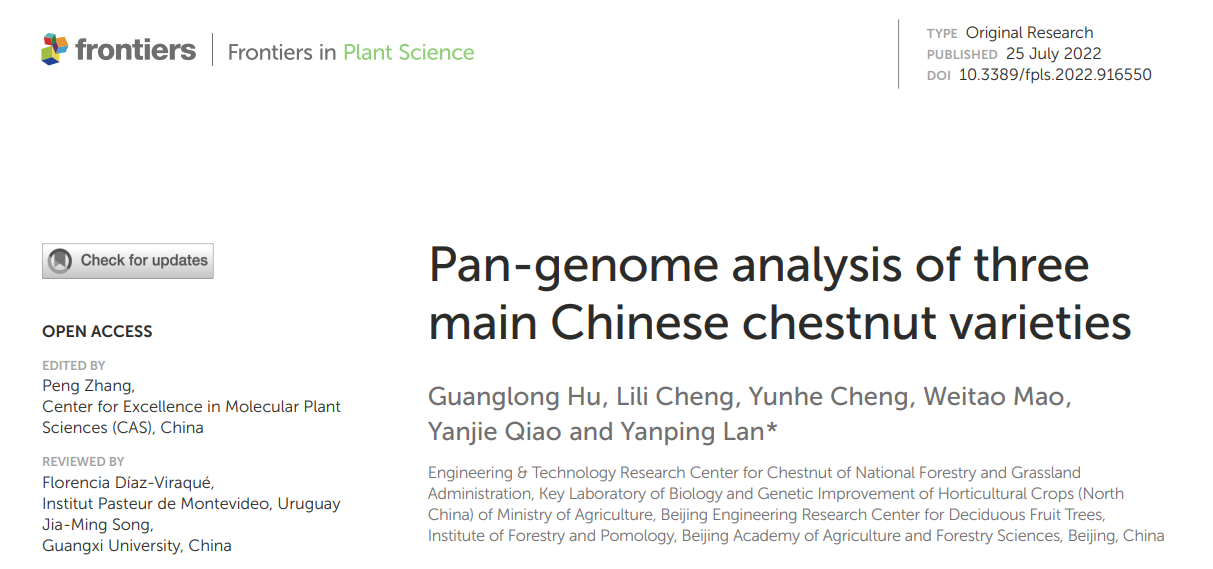 近日,北京市農(nóng)林科學(xué)院林業(yè)果樹研究所蘭彥平團隊在《Frontiers In Plant Science》在線發(fā)表了題為“Pan-genome analysis of three main Chinese chestnut varieties”的研究論文。百邁客有幸為該研究提供板栗基因組測序組裝工作。