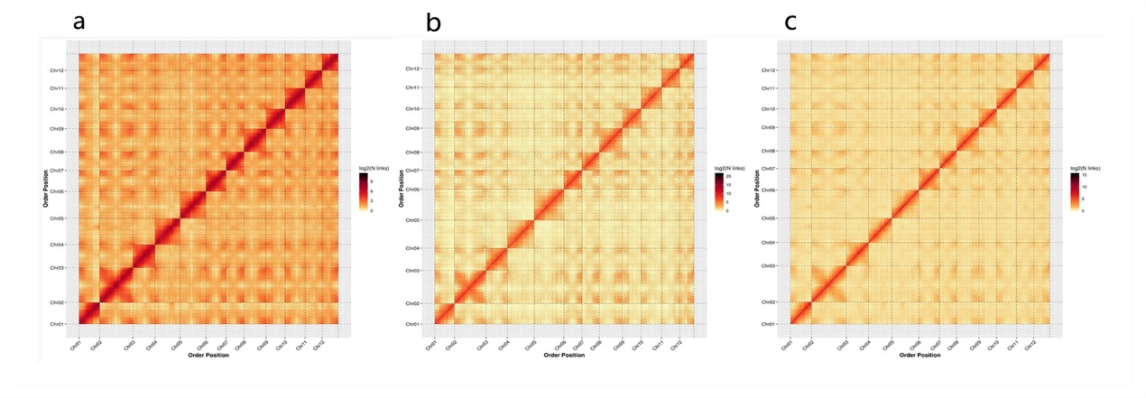 圖1 三個板栗品種基因組Hi-C熱圖、基因家族聚類及基因PAV信息