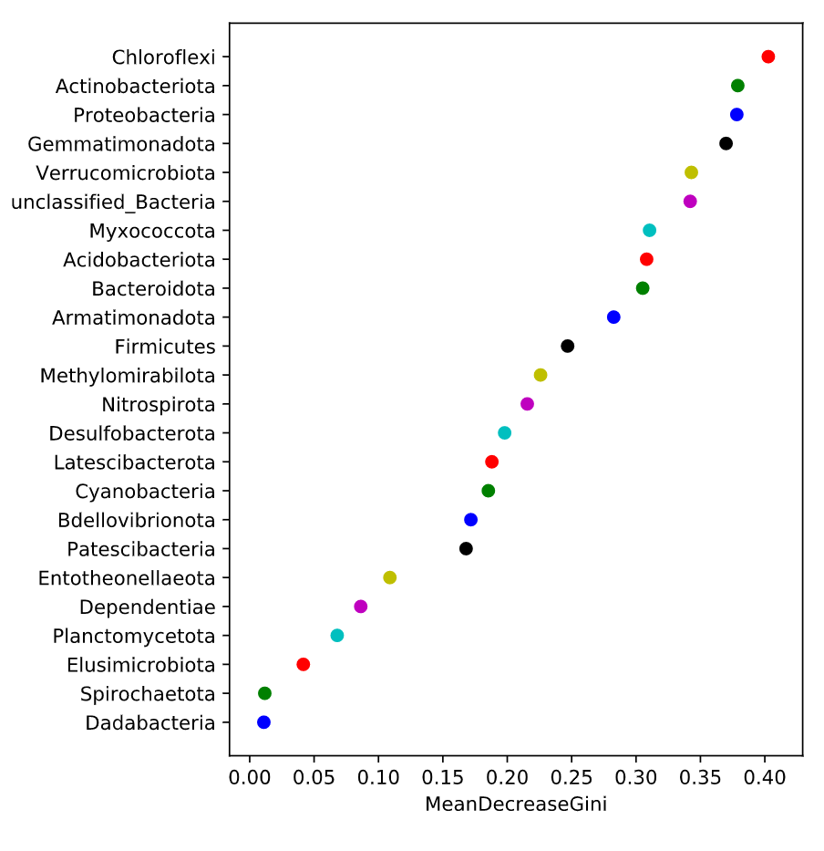 隨機(jī)森林分析:Random forest 分析,隨機(jī)森林指的是利用多棵樹對樣本進(jìn)行訓(xùn)練并預(yù)測的一種分類器,是機(jī)器學(xué)習(xí)的一種。利用隨機(jī)森林分析可以幫我們找到數(shù)據(jù)中重要的特征:在微生物組中就是哪些微生物組成可以作為特征進(jìn)行各種預(yù)測;另外,隨機(jī)森林可以利用這些重要特征構(gòu)建模型用于分類預(yù)測(分類變量)或者回歸預(yù)測(數(shù)值型變量);隨機(jī)森林分析建議分組內(nèi)樣品至少30個(gè)以上,樣品數(shù)太少影響準(zhǔn)確性。 隨機(jī)森林分析,一般將數(shù)據(jù)劃分為訓(xùn)練數(shù)據(jù)集(train data)和測試數(shù)據(jù)集(test or validate data),訓(xùn)練數(shù)據(jù)集用于構(gòu)建預(yù)測模型,測試集用于查看模型的準(zhǔn)確性。