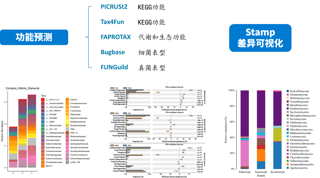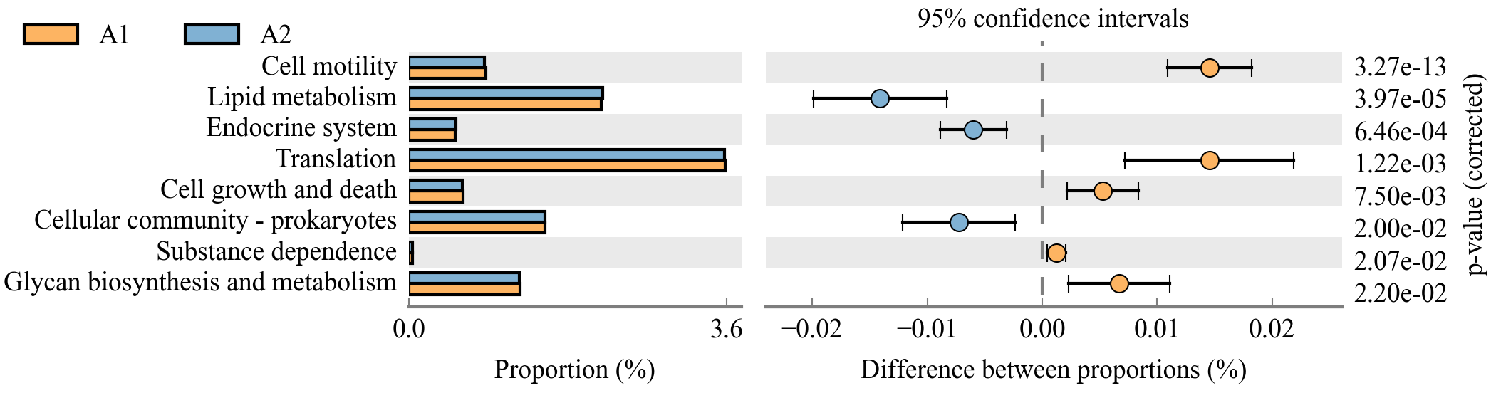 PICRUSt 2 將特征序列(16S rRNA)與微生物基因組數(shù)據(jù)庫(IMG,Integrated Microbial Genomes)參考序列對齊(aliign)構(gòu)建進(jìn)化樹,找到特征序列的“最近物種”,并根據(jù)已知物種的基因種類和豐度信息預(yù)測未知物種的基因信息,從而結(jié)合基因的KEGG通路信息預(yù)測整個(gè)群落的通路情況。通過組間差異分析,得到在組間具有顯著差異的功能,最后利用Stamp對結(jié)果進(jìn)行差異可視化。