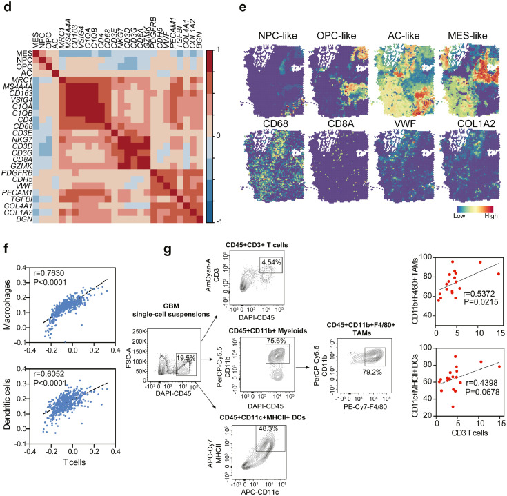 利用反卷積算法對(duì)TCGA數(shù)據(jù)進(jìn)一步進(jìn)行分析,發(fā)現(xiàn)T細(xì)胞豐度與巨噬細(xì)胞、樹(shù)突狀細(xì)胞顯著相關(guān),這是兩個(gè)主要的髓系細(xì)胞(圖3f);利用流式細(xì)胞術(shù),分析小鼠GBM中的免疫細(xì)胞,證實(shí)了T細(xì)胞與CD11b + F480 +腫瘤相關(guān)巨噬細(xì)胞(TAM)或CD11c + MHCII + DC顯著正相關(guān)(圖3g)。因此,間充質(zhì)亞型中T細(xì)胞比例較高主要是由于巨噬細(xì)胞的浸潤(rùn)。