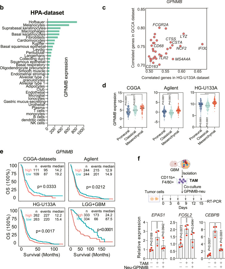 HPA和TCGA數(shù)據(jù)分析結(jié)果顯示,GPNMB主要在巨噬細(xì)胞中表達(dá),并且與巨噬細(xì)胞標(biāo)志物顯著正相關(guān),這表明巨噬細(xì)胞是GPNMB的主要來(lái)源(圖4b, c),流式細(xì)胞術(shù)結(jié)果證實(shí)了GPNMB主要在巨噬細(xì)胞上表達(dá),而不是樹(shù)突狀或腫瘤細(xì)胞。Tips:流式細(xì)胞術(shù)是單細(xì)胞測(cè)序常見(jiàn)的下游驗(yàn)證方法,可用來(lái)分選目標(biāo)細(xì)胞類(lèi)群、驗(yàn)證細(xì)胞比例的變化和新鑒定的maker基因作為特定細(xì)胞分選的可行性等。
