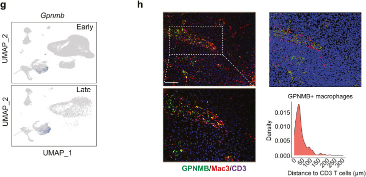 收集小鼠GBM scRNA-seq數(shù)據(jù),重點(diǎn)關(guān)注在早期(d7)和晚期(d28)GBM小鼠的CD45 +免疫細(xì)胞。根據(jù)細(xì)胞maker基因表達(dá)鑒定到了NK cells、Cd8+ T cells、Cd4+ T cells、 B cells、neutrophils、cDC1、cDC2、pDC、mDC、monocytes、TAM、monocytes/TAM、microglia cells(圖5a);與以往的報(bào)道類(lèi)似,巨噬細(xì)胞隨著腫瘤進(jìn)展急劇侵入腫瘤部位,而小膠質(zhì)細(xì)胞在腫瘤發(fā)展過(guò)程中逐漸消失(圖5b);細(xì)胞軌跡分析推斷出樹(shù)突狀細(xì)胞和巨噬細(xì)胞起源于單核細(xì)胞,并隨著腫瘤進(jìn)展而逐漸分化(圖5c);不同的通路主導(dǎo)了腫瘤浸潤(rùn)T細(xì)胞的募集,單核細(xì)胞主要表達(dá)Cxcl10、Cxcl9、樹(shù)突狀細(xì)胞特異性表達(dá)Ccl17、Ccl22,而巨噬細(xì)胞表達(dá)Ccl24,Saa3、Arg1和Gpnmb僅在巨噬細(xì)胞中出現(xiàn)(圖5d);在腫瘤發(fā)生過(guò)程中,Arg1和Gpnmb的表達(dá)在巨噬細(xì)胞中被強(qiáng)烈誘導(dǎo)(圖5e-g),這與人GBM數(shù)據(jù)集中的發(fā)現(xiàn)一致;然而,Gpnmb敲低后CD206(經(jīng)典M2巨噬細(xì)胞標(biāo)志物)表達(dá)不變,提示GPNMB不是M2巨噬細(xì)胞極化的驅(qū)動(dòng)因素;免疫熒光染色顯示GPNMB+巨噬細(xì)胞與T細(xì)胞共定位(圖5h),表明它們之間存在潛在的相互作用。
