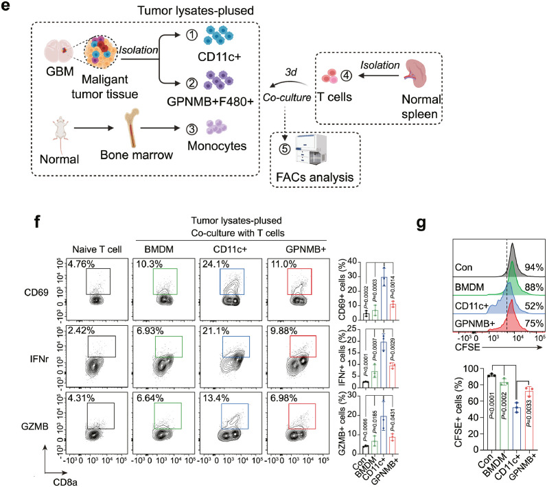 利用CytoTalk算法分析GBM中T細(xì)胞與APC-like細(xì)胞間的相互作用,研究完整的信號(hào)轉(zhuǎn)導(dǎo)途徑,結(jié)果顯示,T細(xì)胞通過(guò)Chemokines、cytokines、co-stimulatory/inhibitory、antigen-presentation通路與單核細(xì)胞、Gpnmb-high巨噬細(xì)胞、樹(shù)突狀細(xì)胞相互作用,并且DC細(xì)胞與Gpnmb-high巨噬細(xì)胞共享Cxcl16-Cxcr6趨化因子信號(hào)與T細(xì)胞相互作用。為了驗(yàn)證Gpnmb-high巨噬細(xì)胞的調(diào)控機(jī)制,從GBM腫瘤和正常小鼠中提取F4/80 + GPNMB +巨噬細(xì)胞、D11c + DC和骨髓來(lái)源的單核細(xì)胞,然后與na?ve T細(xì)胞共培養(yǎng)(圖6e);實(shí)驗(yàn)結(jié)果顯示,與GPNMB+巨噬細(xì)胞和單核細(xì)胞相比,CD11c + DC共培養(yǎng)表達(dá)更高水平的CD69、IFNγ和GZMB,能更好地誘導(dǎo)T細(xì)胞活化(圖6f);T細(xì)胞增殖實(shí)驗(yàn)檢測(cè)結(jié)果也表明,與GPNMB+巨噬細(xì)胞和單核細(xì)胞相比,CD11c + DC能顯著促進(jìn)T細(xì)胞增殖(圖6g)。綜合以上結(jié)果,確定了關(guān)鍵的GPNMB-high巨噬細(xì)胞亞群是GBM細(xì)胞間通訊的樞紐,不僅誘導(dǎo)PN-MES腫瘤細(xì)胞轉(zhuǎn)化,而且通過(guò)與DC競(jìng)爭(zhēng)而損害T細(xì)胞激活。Tips:利用細(xì)胞通訊分析篩選潛在細(xì)胞間互作的受體-配體對(duì),結(jié)合細(xì)胞共培養(yǎng)、co-IP和免疫熒光等實(shí)驗(yàn),可以探究目標(biāo)細(xì)胞類(lèi)型對(duì)特定細(xì)胞功能的影響及機(jī)制。