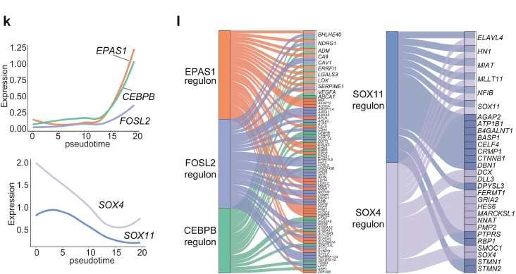 利用SCENIC分析PN或MES細(xì)胞中的關(guān)鍵轉(zhuǎn)錄調(diào)控網(wǎng)絡(luò),結(jié)果顯示,轉(zhuǎn)錄因子E2F1、SOX9、RARA、SOX11和SOX4在OPC和NPC細(xì)胞中差異過(guò)表達(dá),而 EAPS1、CEBPB、FOSL2、STAT2和EGR1在MES和AC細(xì)胞狀態(tài)中差異過(guò)表達(dá),細(xì)胞軌跡分析證實(shí)了PN-MES轉(zhuǎn)換過(guò)程中EPAS1、CEBPB和FOSL2的激活以及SOX4、SOX11的下調(diào)(圖2k)。以上結(jié)果突出了從PN到MES細(xì)胞狀態(tài)的動(dòng)態(tài)轉(zhuǎn)變主要是由關(guān)鍵轉(zhuǎn)錄因子驅(qū)動(dòng)的。