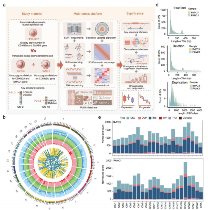 研究人員通過整合三代人重測序、高通量染色質(zhì)構(gòu)象捕獲( Hi-C) 和 RNA-seq等多組學(xué)技術(shù),對源自人胰腺導(dǎo)管上皮的胰腺癌細胞和正常人胰腺導(dǎo)管上皮細胞進行了深入研究和綜合分析,成功揭示了PDAC細胞中SV的特征圖譜和染色體空間結(jié)構(gòu)的多尺度重塑,并進一步闡釋了SV與染色質(zhì)三維結(jié)構(gòu)之間的復(fù)雜的相互作用及其對基因表達的影響。這一發(fā)現(xiàn)為全面了解SV在胰腺癌發(fā)展中的致病機制提供了全基因組資源和新的空間視角,這可能有助于識別新的預(yù)后標志物和治療靶點。