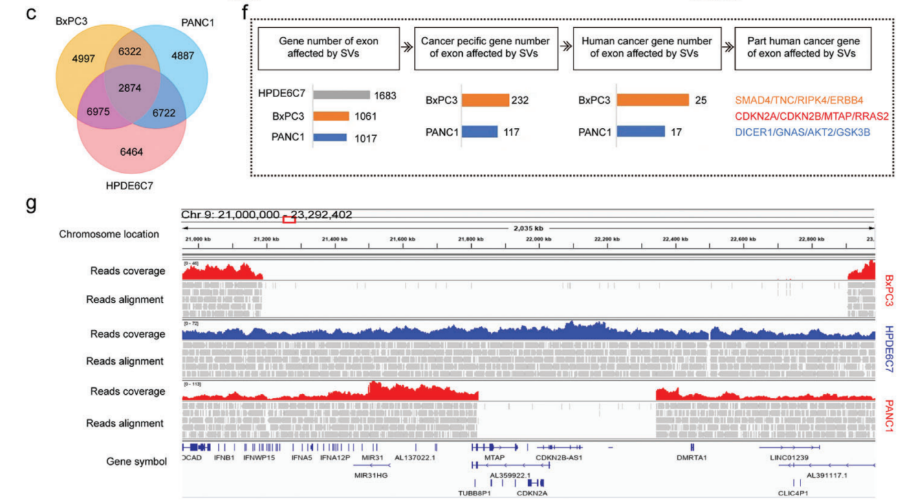 研究了在其外顯子區(qū)域受到SV直接影響的基因,并分別在PANC1、BxPC3和HPDE6C7中檢測到了1017、1061和1683個基因的變化。在PANC1中獨立檢測到14號染色體上的DICER1擴增,19號染色體上的AKT2缺失和20號染色體上的GNAS插入。在BxPC3中特異性地檢測到9號染色體上的TNC缺失,11號染色體上的RRAS2插入和18號染色體上的SMAD4缺失。BxPC3樣本中還存在許多基因大片段缺失,長度超過1.7 Mb,包括CDKN2A、CDKN2B、MTAP和DMRTA1等基因?;陂L讀長測序結(jié)果建立了人類胰腺癌中SV的特征,為全面研究SV在這種致命惡性腫瘤中的發(fā)病機制提供寶貴的資源。