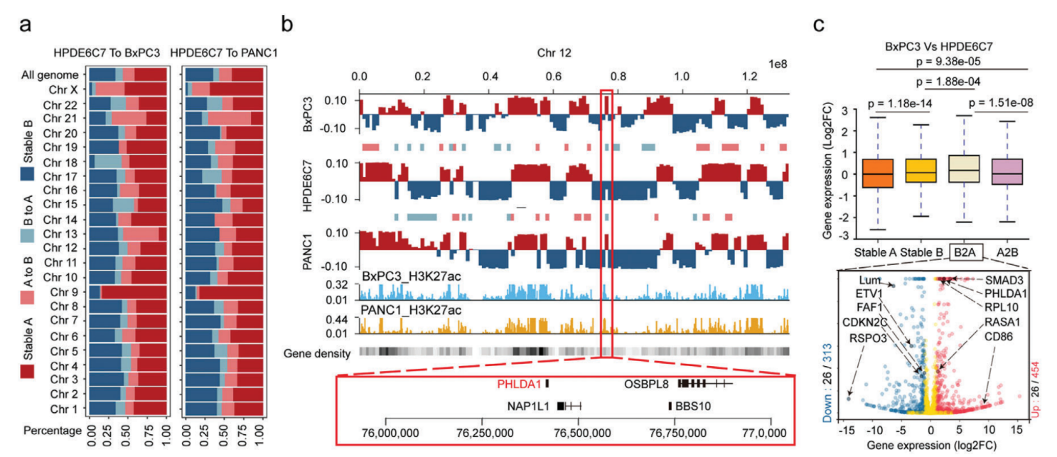 PADC中染色質(zhì)A/B室置換分析,與正常細胞相比,BxPC3中A/B置換的總發(fā)生率分別為24.8%(A到B,15.3%;B到A,9.5%)和PANC1中的24.1%(A到B,16.2%;B到A,7.9%)。A/B置換與基因密度和調(diào)節(jié)活性的變化有關(guān),穩(wěn)定的A和B室到A室置換是具有活性轉(zhuǎn)錄的基因豐富的區(qū)域,而穩(wěn)定的B室和A室到B室置換具有相反的特性,RNA-seq數(shù)據(jù)相結(jié)合也證實這一結(jié)論。其中癌癥樣本中PHLDA1是位于12號染色體共同B到A室置換的基因,在兩個癌細胞系中都顯著上調(diào),PHLDA1在幾種惡性腫瘤中顯著上調(diào),包括胰腺癌、低級膠質(zhì)瘤和黑色素瘤,它與胰腺癌預(yù)后不佳顯著相關(guān)。這些結(jié)果表明兩個癌細胞系(BxPC3和PANC1)中染色質(zhì)A和B室的空間分布發(fā)生了變化,這些轉(zhuǎn)變與癌癥相關(guān)基因的表達變化顯著相關(guān)。