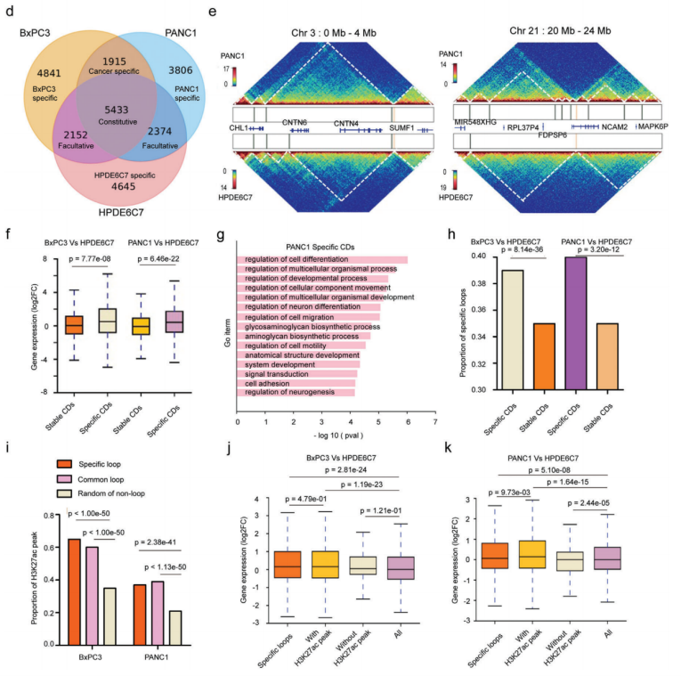 PDAC中的接觸域(CD)改變分析,拓撲關(guān)聯(lián)域(TAD)是染色質(zhì)結(jié)構(gòu)的功能單位,這里利用高分辨率Hi-C(5kb)測序檢測正常細胞系和癌細胞系的接觸域邊界(CDB),在HPDE6C7、BxPC3和PANC1細胞系中確定了14 581、14 318和13 494 CD,平均大小分別為211、227和214kb。CDB保存在人類基因組中任何兩種細胞類型之間共享的CDB很少,CD數(shù)量和大小的變化可能會在不同的染色體區(qū)域出現(xiàn)截然相反的變化。與共享的的CD相比,癌癥特異性CD區(qū)域與上調(diào)基因表達的關(guān)聯(lián)要大得多。這些癌癥特異性CD中差異表達基因的GO富集分析顯示,改變的基因涉及幾種關(guān)鍵途徑,包括癌癥促進、細胞分化、細胞粘附、細胞運動和遷移。