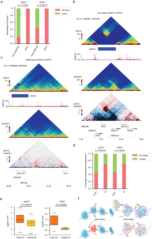 分析了兩個癌細胞系中CD融合與差異基因表達之間的相關(guān)性。結(jié)果表明,融合CD中差異表達基因的比例明顯高于基因組其他區(qū)域,總的來說,這些數(shù)據(jù)表明,癌癥特異性SV可以通過重塑PDAC中的CD來調(diào)節(jié)基因表達。
