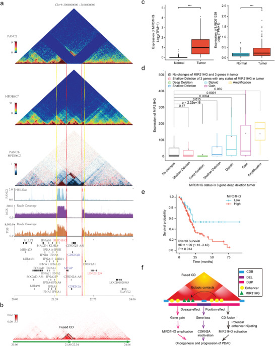 CDKN2A失活通過各種機制發(fā)生在約90%的PDAC中,其中純合子缺失是常見的途徑之一。此次研究證實了BxPC3和PANC1中CDKN2A的純合子缺失,發(fā)現(xiàn)缺失兩側(cè)相鄰CD之間的相互作用顯著增強,形成融合CD,相鄰CD區(qū)域之間的內(nèi)部相互作用也顯著增強。發(fā)現(xiàn)CDKN2A、CDKN2B和MTAP(缺失區(qū)域的基因)的表達幾乎消失了,而MIR31HG和LINC01239(缺失區(qū)域兩側(cè)的基因)的表達被顯著上調(diào)。發(fā)現(xiàn)MIR31HG表達高患者的生存率顯著縮短(圖5e),與MIR31HG在PDAC中的致癌作用一致。該研究揭示了CDKN2A純合子缺失對三維基因組結(jié)構(gòu)和基因表達的影響,為了解CDKN2A失活以推動PDAC的發(fā)生和發(fā)展提供了新的見解。