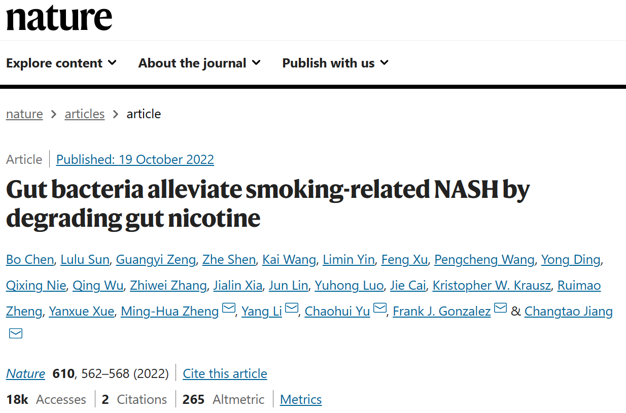 研究內(nèi)容:吸煙與非酒精性脂肪肝(NAFLD)呈正相關(guān),但這種關(guān)聯(lián)的潛在機制尚不清楚。在此研究中,揭示了尼古丁在腸道內(nèi)積累,并激活腸道AMPKα。研究發(fā)現(xiàn)腸道細(xì)菌Bacteroides xylanisolvens是一種有效的尼古丁降解菌。B. xylanisolvens的定植可以降低暴露于尼古丁的小鼠腸道尼古丁濃度,并且可以改善尼古丁加重的非酒精性脂肪肝的進(jìn)展情況。從機制上來說,AMPKα促進(jìn)鞘磷脂磷酸二酯酶3(SMPD3)的磷酸化,穩(wěn)定后者,從而增加腸道神經(jīng)酰胺的形成。該研究結(jié)果確立了腸道尼古丁積累在非酒精性脂肪肝進(jìn)展中的作用,并揭示了人類腸道中具有代謝尼古丁能力的一種內(nèi)源性細(xì)菌。這些發(fā)現(xiàn)也為減少吸煙加劇的非酒精性脂肪肝的進(jìn)展提供了可能的途徑。