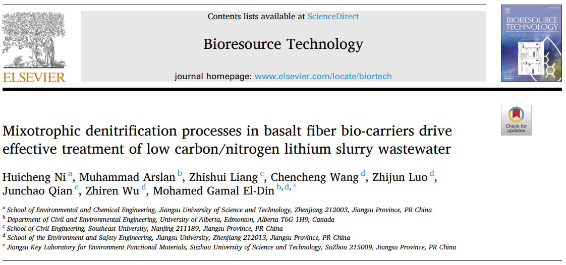 研究內(nèi)容:通過在生物接觸氧化反應(yīng)器中使用玄武巖纖維(BF)生物載體,成功處理了鋰電池漿液廢水。結(jié)果顯示在12小時的HRT和0-1mg/L的溶解氧(DO)下,COD(93.3±0.5 %)和總氮(77.4±1.0 %)明顯減少。改進(jìn)后的Stover-Kincannon模型表明,R-BF的總脫氮率為4.462 kg/m3/d,而Monod模型中的底物最大比反應(yīng)速率(qmax)為0.323 mg-N/mgVSS/d。在生物巢內(nèi)建立了穩(wěn)定的內(nèi)部環(huán)境。微生物分類學(xué)分析顯示存在反硝化脫碳菌、異養(yǎng)硝化-好氧反硝化聯(lián)合菌、亞硝酸鹽氧化菌和氨氧化菌。功能分析顯示R-BF中與(有氧)化能異養(yǎng)、氮呼吸、硝酸鹽還原、亞硝酸鹽呼吸/反硝化和硝酸鹽相關(guān)的變化。該研究提出了一種在低C/N條件下實現(xiàn)鋰漿廢水處理的反硝化的新方法。