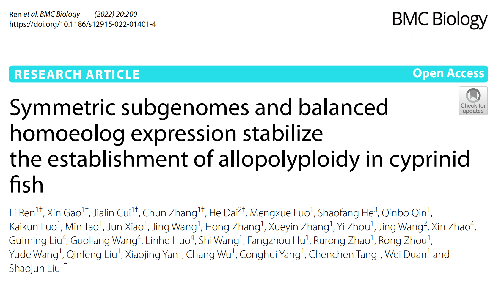 研究內(nèi)容:構(gòu)建了高質(zhì)量的異源四倍體鯽鯉F22代基因組(2.95Gb)。與親本紅鯽和鯉比較,發(fā)現(xiàn)異源四倍體個(gè)體中200條染色體一半來自于紅鯽一半來自于鯉,同源染色體間存在重組交換現(xiàn)象。推測DNA修復(fù)和減數(shù)分裂重組等機(jī)制在異源四倍體鯽鯉品系形成過程中共同發(fā)揮作用。交個(gè)體中紅鯽和鯉來源基因在表達(dá)和DNA甲基化層面存在多種變化特征。本研究為后續(xù)進(jìn)一步揭示通過遠(yuǎn)緣雜交形成的其它可育品系的遺傳特性提供了重要的參考。