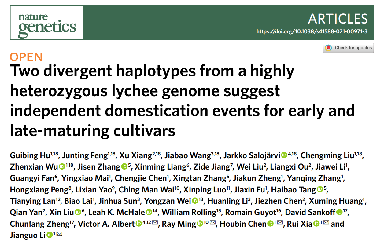 研究內(nèi)容:基于荔枝(Litchi chinensis)基因組的高度雜合(~2.27%),構(gòu)建了兩套高質(zhì)量“妃子笑”單倍型基因組(470 Mb)。72份荔枝重測序分析發(fā)現(xiàn),來自云南的一個(gè)野生群體的極早熟荔枝品種主要與“妃子笑”的其中一個(gè)單倍型對應(yīng);來自海南的一個(gè)野生群體的晚熟荔枝品種則與另外一個(gè)單倍型對應(yīng)。早熟荔枝品種可能是極早熟荔枝品種與晚熟荔枝品種的雜交形成的,在廣東培育而成。包含一對CO-like基因的3.7kb序列的缺失變異可能調(diào)控著不同荔枝品種間的果實(shí)成熟差異。