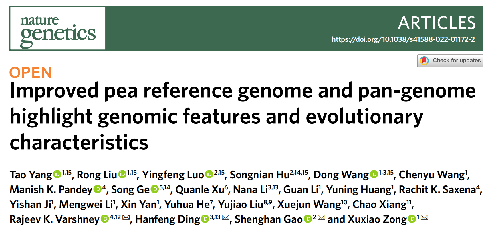 研究內(nèi)容:基于PacBio等技術(shù)構(gòu)建了中國豌豆主栽品種“中豌6號”的高質(zhì)量基因組(3.8 Gb)。通過118 個(gè)栽培和野生豌豆種質(zhì)群體分析,解決了豌豆屬物種劃分的爭議。QTL分析鑒定出與粒型、株高等相關(guān)的候選基因。隨后構(gòu)建了栽培和野生豌豆種質(zhì)的泛基因組,發(fā)現(xiàn)大部分泛基因組多樣性主要存在于不同物種和遺傳分組之間,近緣野生種和地方種表現(xiàn)出豌豆育種資源的重要潛力。該研究為豌豆起源馴化、基因挖掘、種質(zhì)創(chuàng)新和育種改良提供了寶貴資源。