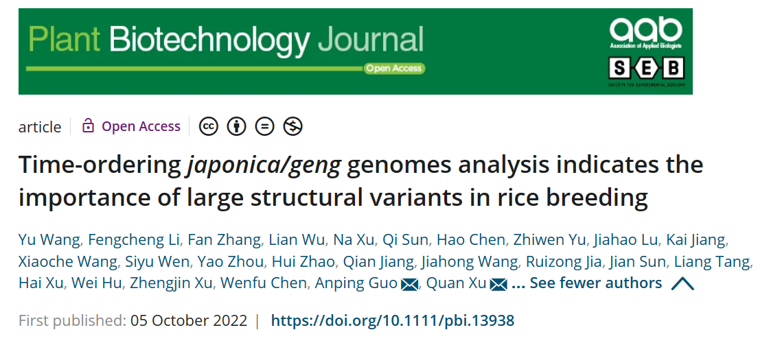 研究內(nèi)容:基于Nanopore平臺構(gòu)建了12個(gè)高質(zhì)量水稻基因組(contigN50 8.77-15.84Mb)。通過全基因組比對分析找尋大量的結(jié)構(gòu)變異(SVs),發(fā)現(xiàn)SV相關(guān)基因可能在葉綠體膜系統(tǒng)中發(fā)揮重要作用,顯性LTG1的水稻品種比具有其他類型等位基因的水稻品種更耐低溫,說明LTG1在調(diào)節(jié)水稻耐寒性中起著關(guān)鍵作用。豐富的基因CNVs是水稻遺傳多樣性的一個(gè)重要特征,研究發(fā)現(xiàn)GNP1的拷貝數(shù)變異(CNVs)可能與水稻粒數(shù)相關(guān)。本研究為擴(kuò)寬粳型栽培稻的遺傳多樣性、進(jìn)一步提升育種潛力提供遺傳基礎(chǔ)。