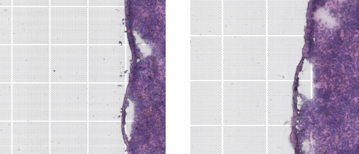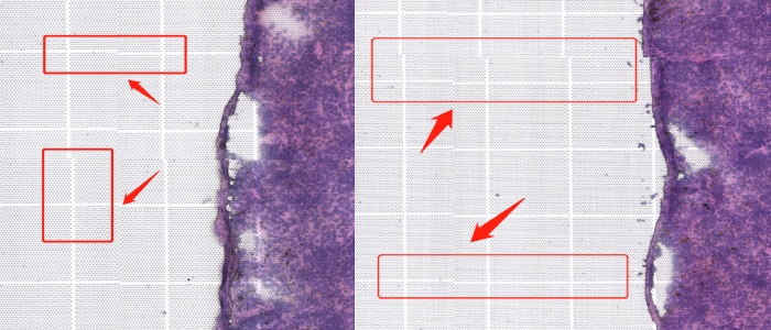 掃描顯微鏡產(chǎn)出的結(jié)果,是對片子各區(qū)域拍照后拼接而來的,部分型號的顯微鏡由于參數(shù)問題在拼接過程中可能會產(chǎn)生“拼接錯誤”。一般情況下,拼接錯誤的誤差在5~10μm左右。如果分析的分辨率較高時,存在“拼接錯誤”的圖像則會和實(shí)際位置產(chǎn)生錯位,進(jìn)而影響到數(shù)據(jù)分析。