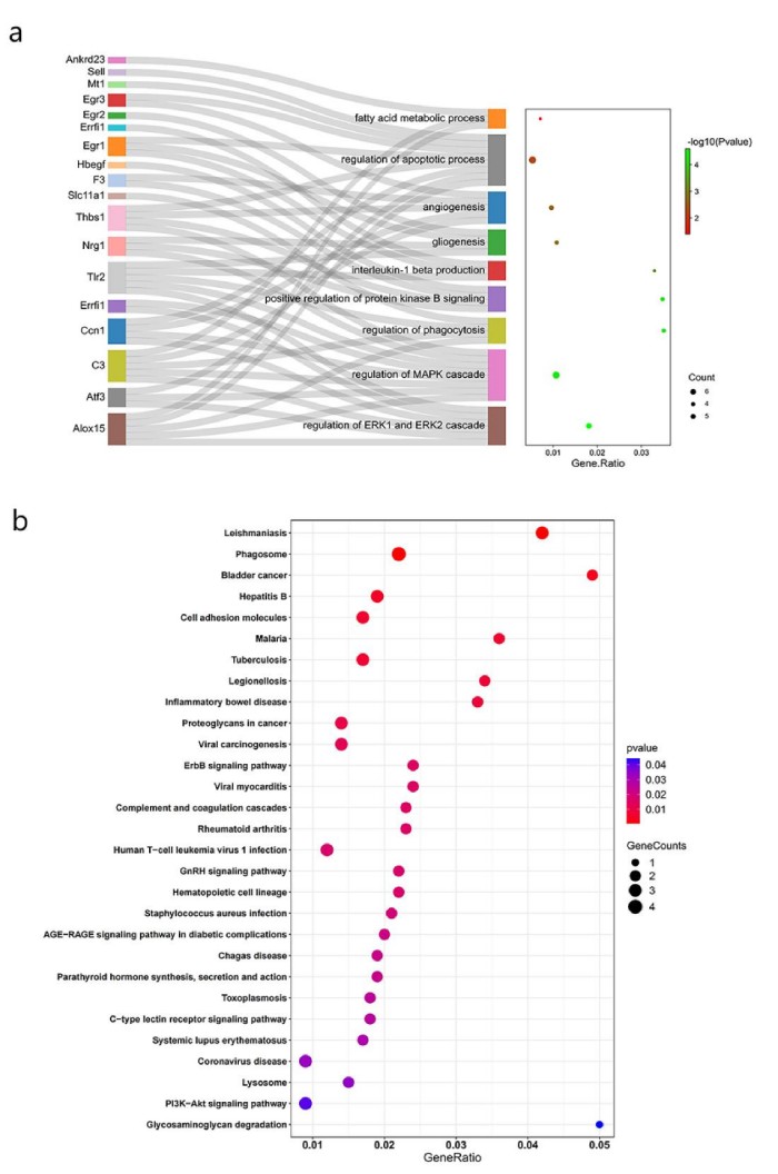 采用Gene Ontology(GO)與Kyoto Encyclopedia of Genes and Genomes(KEGG)對MOTS-c所改變的47個致病基因進行功能富集分析。GO 注釋系統(tǒng)包含三個主要分支,即:生物學過程(BP)、分子功能(MF)和細胞組分(CC)。)8 周 MOTS-c 注射所改變的 47 個糖尿病致病基因共富集于 195 個 GO term 中,其中 188 個 term 富集于 BP,2 個 term 富集于 CC,5 個 term 富集于MF。經(jīng)過 ClueGO 聚類分析后,195 個 term 主要富集于 9 個類別(見圖 5b),分別為血管生成(angiogenesis)、凋亡過程調(diào)控(regulation of the apoptotic process)、MAPK 級聯(lián)調(diào)控(regulation of MAPK cascade)、蛋白激酶活性正調(diào)控(positive regulation of protein kinase activity)、脂肪酸代謝過程(fatty acid metabolic process)、吞噬作用調(diào)節(jié)(regulation of phagocytosis)、蛋白激酶 B 信號正調(diào)控(positive regulation of protein kinase B signaling)、ERK1/2 級聯(lián)(regulation of ERK1/2 cascade)、膠質(zhì)生成(gliogenesis)和白細胞介素-1 的產(chǎn)生(interleukin-1 beta production)。KEGG通路富集分析顯示,18條KEGG通路顯著富集(圖5b),其中5條信號通路與免疫、凋亡和糖代謝相關(ErbB信號通路、補體和凝血級聯(lián)、c型凝集素受體信號通路、PI3K-Akt信號通路和AGE-RAGE信號通路)。在功能富集通路注釋基因中,ALOX15、ATF3、CCN1、EGR1、EGR3、ERRFI1、THBS1、TLR2和NRG1高頻率注釋。CCN1與EGR1基因高表達,同時均注釋在凋亡相關的GO term中,而CCN1也注釋于富集顯著性最高的ERK1/2級聯(lián)通路中,表明CCN1、ERK1/2與EGR1可能是相互關聯(lián)的關鍵基因。