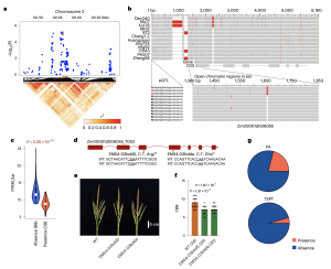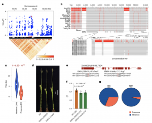 另外,該研究也在14個FILs中鑒定了PAVs,平均鑒定到16,152個PAVs和184個PAV基因(圖3b)。GO富集分析表明,PAV基因在防御反應(yīng)、DNA整合、蛋白質(zhì)磷酸化、萜類生物合成過程、激素介導(dǎo)的信號通路、細胞氧化解毒等生物過程中富集。將19個野生近緣種和23個地方種的重測序數(shù)據(jù)與14個FILs基因組進行比對,在至少一份大芻草或地方種質(zhì)中,平均檢測到93.4%的FIL特異性序列的密切相關(guān)同源物,與之前的報道一致,這些PAVs中的大多數(shù)都是來源于玉米祖先種中存在的變異。