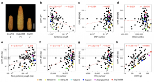 之前研究報道了雜種優(yōu)勢與分子遺傳距離(GD)存在弱正相關(guān)關(guān)系。本研究為了研究產(chǎn)量雜種優(yōu)勢與遺傳變異之間的關(guān)系,首先將基因組劃分為共線性和和非共線性區(qū)域。相關(guān)分析顯示,共線性區(qū)域長度與GYPP的BPH呈顯著負相關(guān)(圖5b)。共線性區(qū)域的SNPs和small InDels僅與GYPP的BPH呈弱相關(guān) (圖5c和5d)。相反,非共線性區(qū)域長度、SV_Number和PAV_Number均與GYPP的BPH呈顯著正相關(guān)(圖5e-g)。其中,SV_Number與GYPP雜種優(yōu)勢表現(xiàn)出強的相關(guān)性(圖5f)。SVs可以進一步分為插入或缺失、串聯(lián)收縮擴張和重復(fù)收縮擴張。其中,插入缺失與GYPP雜種優(yōu)勢的相關(guān)性強。綜上所述,表明SVs的數(shù)量對GYPP的貢獻很顯著,支持了SVs在雜種優(yōu)勢中起主導(dǎo)作用這一觀點。