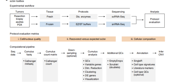 a.?建立了系統(tǒng)性的scRNA-Seq和snRNA-Seq的實(shí)驗(yàn)流程和數(shù)據(jù)分析流程
