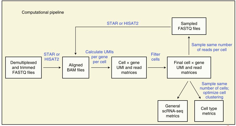 首先,開發(fā)了“scumi”軟件包,從FASTQ文件到產(chǎn)生適用下游分析的基因和細(xì)胞參數(shù);其次,提出了下游分析前過濾低質(zhì)量細(xì)胞的方案,這也是數(shù)據(jù)預(yù)處理的重要挑戰(zhàn),然后對每個實(shí)驗(yàn)類型每個細(xì)胞進(jìn)行相同的reads數(shù)分析;最后,通過關(guān)鍵的參數(shù)對每種方法進(jìn)行評估:①比對到細(xì)胞核和線粒體基因組的reads 及其結(jié)構(gòu);②捕獲RNA的靈敏度;③多胞率;④準(zhǔn)確性和重復(fù)性;⑤得到細(xì)胞類型中重要的生物學(xué)差異的能力(圖2-1)。