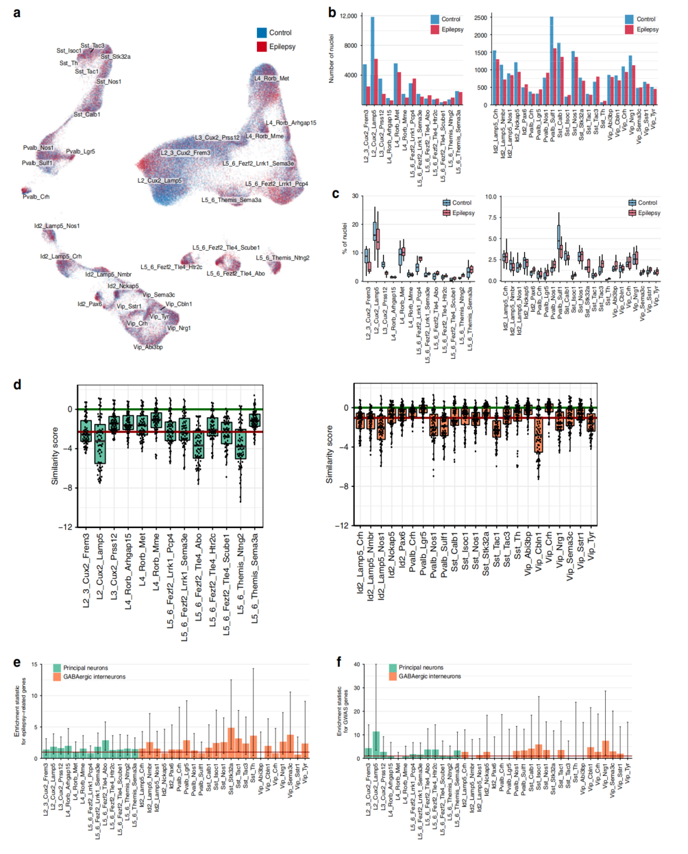 Cux2_Lamp5和L2-3_Cux2_Frem3亞型在癲癇和非癲癇皮質(zhì)中轉(zhuǎn)錄組差異大(圖1d)。對(duì)于gaba能間神經(jīng)元,在癲癇發(fā)作的顳葉皮層中,Vip_Cbln1、Sst_Tac1、Pvalb_Sulf1、Pvalb_Nos1和Id2_Lamp5_Nos1的轉(zhuǎn)錄組改變大。同時(shí)也證實(shí)了癲癇相關(guān)DE基因在具有較大轉(zhuǎn)錄組差異的神經(jīng)元亞型中普遍存在(圖1e、f)。