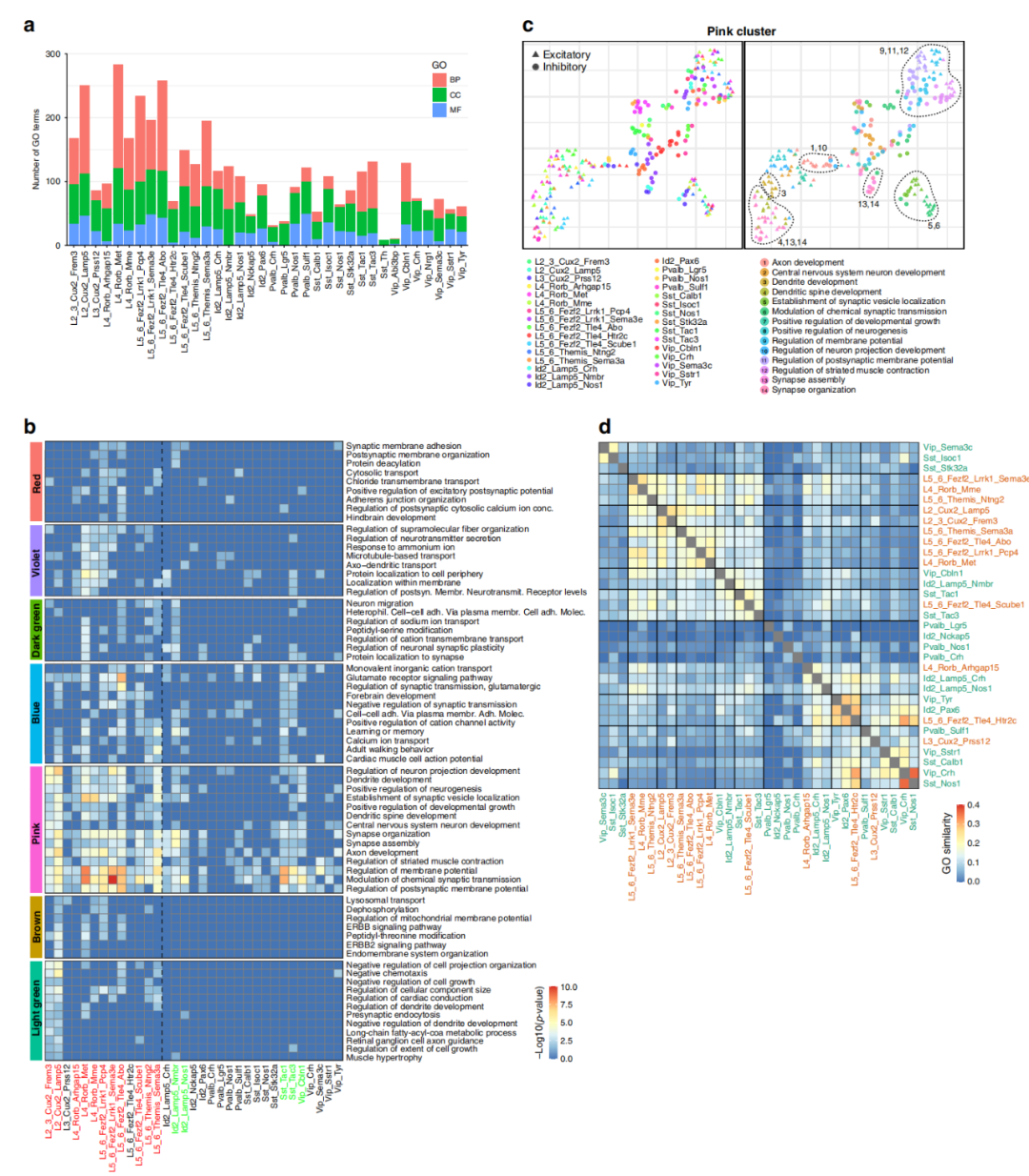 作者計(jì)算了每種已鑒定亞型GO中DE基因的富集程度,一些神經(jīng)元亞型在癲癇中表現(xiàn)出了大的轉(zhuǎn)錄組改變(>100豐富的GO),但多數(shù)神經(jīng)元亞型中只有少數(shù)GO,特別是對(duì)于生物過程(BP)來說,這應(yīng)該與通路的生物學(xué)功能相關(guān)(圖2a)。這些受影響較小的亞型中,大多數(shù)在癲癇細(xì)胞和非癲癇細(xì)胞之間也具有高的基因表達(dá)相關(guān)性(圖1d),從而證實(shí)癲癇和非癲癇之間轉(zhuǎn)錄組相關(guān)性高的亞型中,癲癇改變的信號(hào)通路也較少。