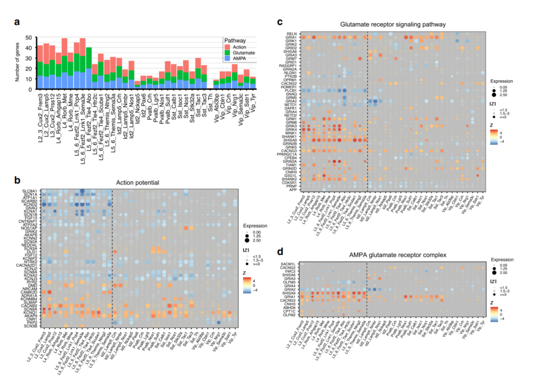 谷氨酸受體,尤其是AMPA受體被證明是癲癇發(fā)作的主要驅(qū)動(dòng)力之一,在篩選出缺乏表達(dá)的基因后,尋找富含與奮性相關(guān)轉(zhuǎn)錄組學(xué)變化的亞型,并從這些GO項(xiàng)中繪制DE基因(圖3a–d)。CKAMP44是貫穿整個(gè)顳葉皮質(zhì)的主要AMPA受體輔助亞基,這一事實(shí)也強(qiáng)調(diào)了CKAMP44上調(diào)的重要性(圖3c, d)。癲癇對(duì)AMPA受體輔助亞基編碼基因的上調(diào)有相當(dāng)普遍的影響。