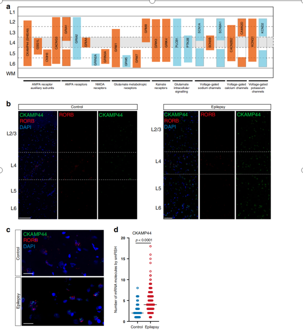癲癇患者皮層谷氨酸介導(dǎo)興奮相關(guān)基因顯著分層上調(diào)或下調(diào)。作者用單分子熒光原位雜交(smFISH)方法標(biāo)記了幾個(gè)高度調(diào)控基因的mRNA。如上所述,在主要神經(jīng)元的亞型中,編碼AMPA輔助亞基的許多基因分層上調(diào)。因此,在一組癲癇和非癲癇樣本的皮質(zhì)切片中標(biāo)記了CKAMP44 mRNA,通過與Rorb和DAPI共標(biāo)記,并確定了L2/3、L4和L5/6的位置(圖4b)。重要的是,證實(shí)了各層中CKAMP44的表達(dá)顯著上調(diào)(圖4b)。