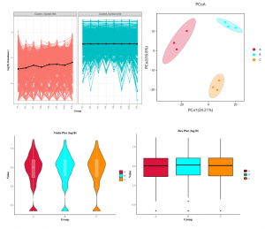 2、主坐標分析可用研究差異分組之間和組內樣本之間的變異度大小。PCoA圖交互式可實現數據標簽的顯示,更改散點形狀和大小,添加置信橢圓和填充顏色等自定義功能;