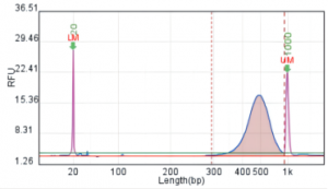 純化后的PCR產(chǎn)物,需要進(jìn)一步濃度和片段大小檢測(cè)。其中濃度能達(dá)到上機(jī)測(cè)序要求即可;片段大小必須滿足:片段范圍為300-700bp,主峰在450-550bp;無接頭片段和大片段污染。質(zhì)檢合格的產(chǎn)物可用于高通量測(cè)序。