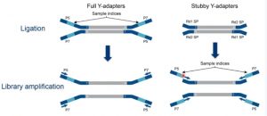 也可根據(jù)接頭是否匹配PCR free建庫的要求,將接頭分為長接頭(完整Y型接頭)和短接頭(非完整Y型接頭)。長接頭包括P5/P7+Index+Read1/Read2序列,可通過TA克隆連接到DNA片段后,形成完整的文庫結(jié)構(gòu),若文庫產(chǎn)量足量時(shí),可不進(jìn)行PCR擴(kuò)增直接上機(jī)測(cè)序。短接頭只包含Read1/Read2序列,通過TA克隆連接到DNA片段后,需要通過PCR擴(kuò)增將P5/P7和Index序列引入文庫結(jié)構(gòu)中,形成完整的文庫結(jié)構(gòu)后進(jìn)行上機(jī)測(cè)序。
