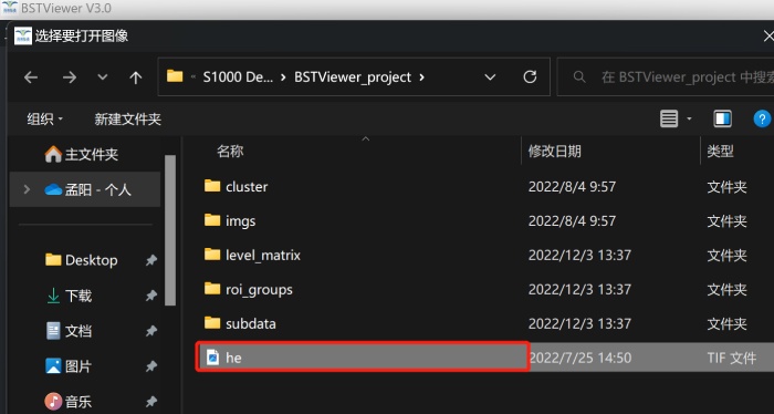 1)將官網(wǎng)下載到的BSTViewer_project文件夾數(shù)據(jù)(或者通過運(yùn)行BSTMatrix 得到的BSTViewer_project 文件夾)存放到英文命名的文件夾之中;【包括各個(gè)級(jí)別分辨率矩陣文件,及BMChiper 或者官網(wǎng)下載的HE 染色圖片】可以同時(shí)在此文件夾下邊新建一個(gè)outdir 作為文件輸出路徑;