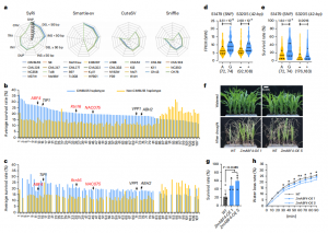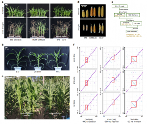 此前研究中,基于全基因組關聯(lián)分析(GWAS)和孟德爾隨機化分析分別鑒定了42個和97個抗旱性候選基因。作者在CIMBL55基因組中對這些位點的基因型進行研究,鑒定得到108個抗旱基因。值得注意的是,在CIMBL55中發(fā)現(xiàn)了65個基因的優(yōu)異單倍型,解釋了CIMBL55優(yōu)良抗旱性的遺傳基礎。此外,在108個基因中,有11個候選基因在非CIMBL55等位基因中被鑒定為優(yōu)勢單倍型,這表明其他種質可能含有與CIMBL55互補的玉米抗旱性遺傳資源(圖3b)。