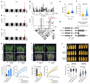 研究發(fā)現(xiàn),位于ZmABF4基因第二內含子的SNP (S1474)和SV (S3205, 42 bp)與該基因的表達和苗期抗旱性密切相關。ZmABF4編碼bZIP轉錄因子,為ABA和干旱誘導表達的主要調節(jié)因子。攜帶ZmABF4CIMBL55等位基因的種質在基因表達和抗旱性方面明顯高于攜帶ZmABF4B73等位基因的種質(圖3d, e)。轉基因過表達分析發(fā)現(xiàn),與野生型(WT)相比,ZmABF4轉基因株系在干旱脅迫下存活率顯著提高,葉片失水率降低(圖3f-h)。說明ZmABF4對玉米抗旱性具有正向調控作用,?ZmABF4CIMBL55可能是玉米抗旱性的優(yōu)異等位基因。