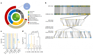 基因共線性反映了不同基因組間的基因含量及其在染色體上的排列。CIMBL55與B73基因組之間的共線基因分析表明,73%的CIMBL55基因位于共線基因塊,27%的基因是非共線基因。共線基因進一步可以分為三類。1類基因(42%)位于B73和CIMBL55的同源染色體上,多數(shù)為單拷貝基因(one-one syntenic)。2類基因(29%)是位于各自基因組中兩條不同同源染色體上的重復基因(multi–multi synteny)(圖2b)。3類基因(2%)位于CIMBL55當前組裝中未定位到染色體上的contigs中,但與B73中的相應基因處于共線性塊中。非共線基因包括class 4(16%)和class 5(11%)2類基因。