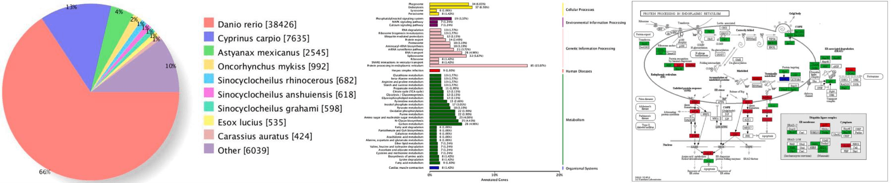 用RNA-seq技術(shù)研究氨脅迫下鯉魚肝胰腺的基因表達譜,共有3367個單基因被鑒定為與氨脅迫相關(guān)的差異表達基因(DEG)。1724DEG下調(diào),1643DEG上調(diào)。KEGG分析將這些DEG的代謝