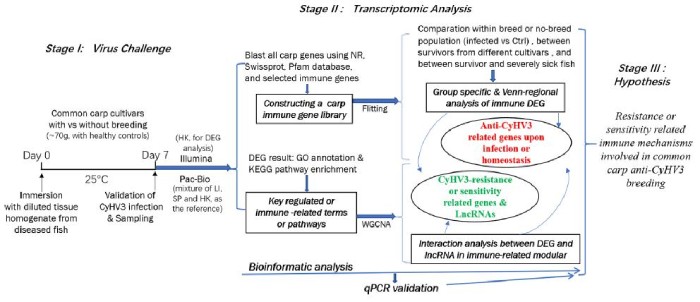 鯉魚皰疹病毒-3(CyHV-3)感染是鯉魚養(yǎng)殖的主要威脅,可導(dǎo)致鯉魚大量的死亡。CyHV-3可通過削弱宿主的免疫系統(tǒng)而使其死亡,導(dǎo)致其對病原微生物易感性,并可能在感染后6至10天內(nèi)出現(xiàn)發(fā)病和死亡。感染CyHV-3后存活下來的鯉魚可以抵抗這種病毒未來的感染。由于CyHV-3在鯉魚中存在潛伏期和持續(xù)性攜帶期,遺傳背景對于了解對病毒的耐藥性至關(guān)重要。德國鏡鯉品系G4是中國廣泛栽培的鯉魚品系,但因CyHV-3病毒引起高死亡率。然而目前在研究抗CyHV-3免疫機制的詳細(xì)免疫系統(tǒng)網(wǎng)絡(luò)方面,還缺乏系統(tǒng)的研究。最近的研究表明,lncRNAs在不同類型病原體感染時的廣泛差異表達(dá),表明lncRNAs在魚類免疫反應(yīng)中起著關(guān)鍵作用。然而,在CyHV-3感染期間,鯉魚體內(nèi)的特異性LncRNA對免疫反應(yīng)的調(diào)節(jié)尚未被研究。第三代測序(如PacBio)可以解碼比第二代測序方法(如Illumina)更長的基因序列,包括mRNA和非編碼RNA在內(nèi)的更高質(zhì)量的轉(zhuǎn)錄本組裝,可能提供對遺傳抗性機制的更詳細(xì)理解。在本研究中,為了揭示鯉魚抗CyHV3育種中涉及的免疫機制,使用圖1所示的策略,對CyHV-3激發(fā)期間的mRNA和長非編碼RNA(lncRNA)進(jìn)行了整合轉(zhuǎn)錄組學(xué)分析。對來自繁殖品系或非繁殖品系的存活鯉魚和健康對照鯉魚的免疫相關(guān)轉(zhuǎn)錄本進(jìn)行了分析。