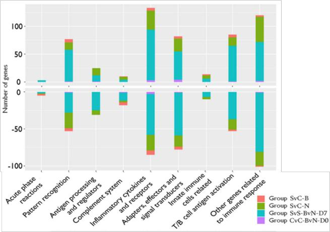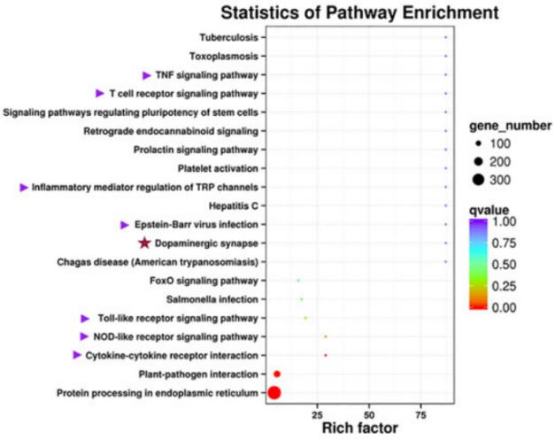 在CyHV-3感染后第0天和第7天提取鯉魚頭腎組織,并通過Illumina和PacBio測序分析轉(zhuǎn)錄組。在對涉及的GOterm和KEGG途徑進(jìn)行分析。加權(quán)基因共表達(dá)網(wǎng)絡(luò)分析用于揭示lncRNA對免疫基因的調(diào)節(jié)。結(jié)果表明,繁殖鯉魚品系通過一種特定的先天免疫機制對CyHV-3感染產(chǎn)生了顯著的抗性,主要的生物學(xué)過程是自噬、吞噬、細(xì)胞毒性和凝集素和MUC3阻斷病毒。此外,還有免疫抑制信號途徑,如IL21R對STAT3的抑制,PI3K介導(dǎo)的感染時多巴胺對炎癥的抑制,以及NLRC3在穩(wěn)定狀態(tài)下對STING的抑制。從非抗性品系中還發(fā)現(xiàn)了CyHV-3的可能易感因素,如ITGB1、TLR18和CCL4。本研究結(jié)果還表明,LncRNA調(diào)節(jié)的Nramp和PAI分別促進(jìn)病毒感染和感染細(xì)胞的增殖,而T細(xì)胞白血病同源框3(TLX3),以及l(fā)ncRNA的半乳糖凝集素3可能在抗病制中發(fā)揮作用。因此,免疫遺傳不敏感或易受CyHV-3感染的免疫因子已被揭示。