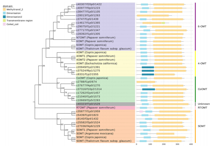進一步研究發(fā)現(xiàn),其中參與合成具有廣泛臨床鎮(zhèn)痛潛力的關(guān)鍵代謝物四氫巴馬汀的酶可能與唯一已知的黃連中負責催化這一步反應的ColumbamineO-methyltransferase(CoOMT)存在較大的蛋白質(zhì)序列差異。通過系統(tǒng)發(fā)生樹分析,作者們推斷出至少存在10種unigenes的翻譯產(chǎn)物可能催化四氫巴馬汀的合成。 特異性的氧甲基化是四氫巴馬汀與紫堇達明合成的關(guān)鍵,延胡索中是否存在特殊的一類OMT或者具有不同底物特異性的OMT則是接下來將要重點解析的重點。