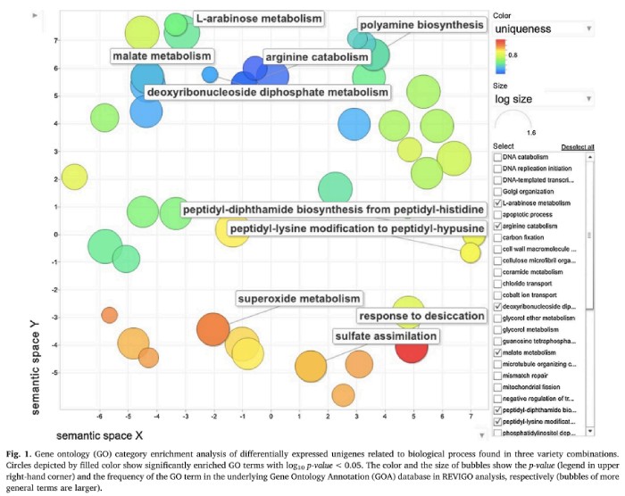 對(duì)差異表達(dá)的基因進(jìn)行 GO 富集分析。在生物過(guò)程類別中,主要與超氧化物酶代謝,精氨酸分解代謝,蘋(píng)果酸代謝和多胺生物合成有關(guān)。分子功能類別中的富集類別為硫氧還蛋白活性,固醇結(jié)合,L-蘇氨酸氨裂解酶活性和富馬酰乙酰乙酸酶活性。在細(xì)胞成分類別中,主要為高爾基體堆積,小亞基加工體,細(xì)胞外間隙和 1,3-β-D-葡聚糖合酶復(fù)合體。