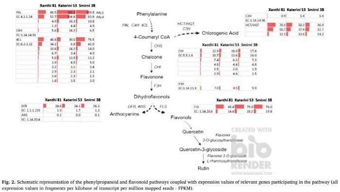查爾酮合酶(CHS)是類黃酮生物合成中的關(guān)鍵酶。研究者發(fā)現(xiàn)兩個(gè) CHS基因在三個(gè)煙草品種的葉片中均低表達(dá),因?yàn)?CHS 主要在花中組成性表達(dá),但其表達(dá)主要是由非生物/生物脅迫誘導(dǎo)的。注釋為 CHS-1B 或 CHS2 的Nitab4.5_0002920g0060.1 在’Katerini 53’和’Xanthi 81’中略有上調(diào),但第二個(gè)注釋為 III 型聚酮化合物合酶(NCBI:XP_016446648.1)差異很小。所有 CHI 基因也僅以低水平表達(dá),在鑒定的結(jié)果中 F3H 也沒(méi)有差異。另一方面,鑒定了兩個(gè)參與黃酮醇形成的 FLS 基因。FLS1(Nitab4.5_0005357g0020.1)(NCBI:LOC107794305)的表達(dá)最高,而 NtFLS(Ni-tab4.5_0006276g0010.1)的表達(dá)低得多。這兩個(gè)基因在品種之間沒(méi)有差異表達(dá)。還檢測(cè)到有助于花色苷生物合成的基因,例如 DFR 和 ANS。DFR 中第一個(gè)僅適度表達(dá),另外一個(gè)沒(méi)有差異。ANS(Nitab4.5_0003274g0110.1)幾乎未表達(dá)(圖 2)。蘆丁是一種黃酮醇糖苷,在花青素途徑生物合成,其中包括黃酮醇 3-O-葡萄糖基轉(zhuǎn)移酶和黃酮醇 3-O-葡萄糖苷胰島素轉(zhuǎn)移酶。結(jié)果表明低表達(dá)的 4 種黃酮醇 3-O-糖基轉(zhuǎn)移酶和 2種黃酮醇 3-O-糖苷胰島素轉(zhuǎn)移酶在“Smirrni 3B”和“Xanthi 81”比“Katerini 53”中表達(dá)更高、更多。