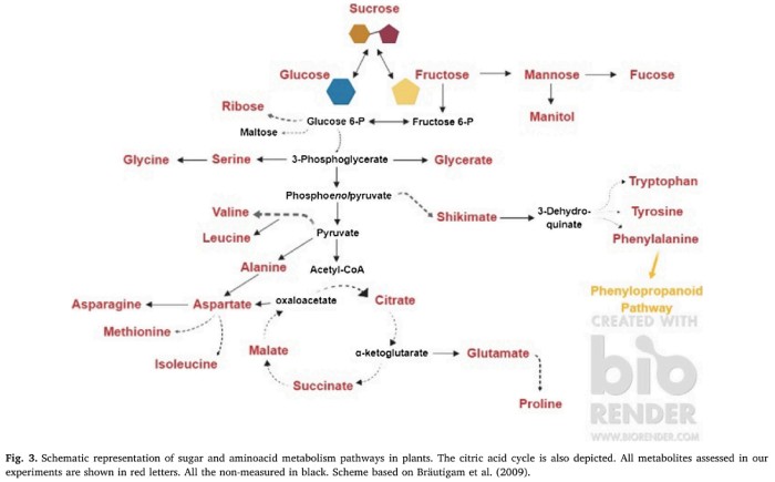采集“Katerini 53”,“Xanthi 81”和“Smirrni 3B”葉片樣品,并使用氣相色譜GC-MS 和 LC-MS / MS 方法進(jìn)行代謝分析?;蛐皖A(yù)先鑒定為不同的色譜模式,共有 78 種代謝化合物(包括糖,氨基酸,有機(jī)酸)差異積累,如圖 3 所示。詳細(xì)的非靶向 GC-MS 代謝組學(xué)分析用于鑒定煙葉中產(chǎn)生的大多數(shù)主要代謝產(chǎn)物。在本研究中,所測(cè)得的最豐富的可溶性糖是果糖,葡萄糖,半乳糖和蔗糖。在果糖和蔗糖中檢測(cè)到統(tǒng)計(jì)學(xué)差異;“Katerini 53”中的果糖含量更高,而“Smierni 3B”中的蔗糖含量更高。“Katerini 53”與其它兩個(gè)品種相比葡萄糖和半乳糖水平較高,差異無(wú)統(tǒng)計(jì)學(xué)意義。在可溶性醇中,兩個(gè)豐富的代謝產(chǎn)物是山梨糖醇和肌醇,但在品種之間未檢測(cè)到統(tǒng)計(jì)學(xué)上的顯著差異。這三個(gè)品種中的蘋(píng)果酸含量沒(méi)有任何統(tǒng)計(jì)上顯著不同?!癤anthi 81”葉子的氨基酸含量最高,但谷氨酸和 γ-氨基丁酸(GABA)除外。GABA 和脯氨酸是煙葉中的主要氨基酸。與其他兩個(gè)品種相比,“Smirrni 3B”中的 GABA 水平明顯更高。’Smirrni 3B’和’Xanthi 81’中的脯氨酸水平較高,而“Katerini 53”的脯氨酸水平最低。在“Smirrni 3B”中檢測(cè)到了高濃度的甘氨酸和絲氨酸這兩種必需氨基酸。煙草生物堿在根部合成,然后轉(zhuǎn)運(yùn)到葉片。生物堿、尼古丁與植物抗草食動(dòng)物防御有關(guān)。在三個(gè)品種中檢測(cè)到的尼古丁濃度在統(tǒng)計(jì)學(xué)上有顯著差異。結(jié)果表明,“Xanthi 81”的尼古丁濃度最高,而“Smirrni 3B”的尼古丁濃度最低。與“Katerini 53”相比,“Xanthi 81”中腐胺的含量有所降低,但其濃度仍高于“Smirrni 3B”。鑒定了所有擬參與煙草中尼古丁生物合成的相應(yīng)基因,但僅發(fā)現(xiàn)少數(shù)幾個(gè)在成熟葉片中表達(dá)。然而,基因 XS 和 QPT(三分之二)在“Xanthi 81”中表達(dá)較高。與其它兩個(gè)品種相比,這與“Xanthi 81”葉片中較高的尼古丁含量相關(guān),這表明它可能是遺傳控制的。