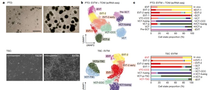 接下來(lái),作者探討了在VCT到EVT分化過程中觸發(fā)的細(xì)胞內(nèi)在調(diào)控程序是否存在于源自兩種自我更新的初級(jí)滋養(yǎng)層類器官(PTO)和滋養(yǎng)層干細(xì)胞(TSC)產(chǎn)生的EVTs中。通過對(duì)以下樣本進(jìn)行了scRNA-seq:(1)實(shí)驗(yàn)組:在EVTM培養(yǎng)基中分化的PTO(PTO-EVTM), 對(duì)照組:在滋養(yǎng)層培養(yǎng)基(TOM)中生長(zhǎng)的PTO(PTO-TOM);(2)在EVTM培養(yǎng)基中分化的TSC(TSC-EVTM),對(duì)照組:在滋養(yǎng)層干細(xì)胞培養(yǎng)基中生長(zhǎng)的TSCs(TSC-TSCM)。發(fā)現(xiàn):