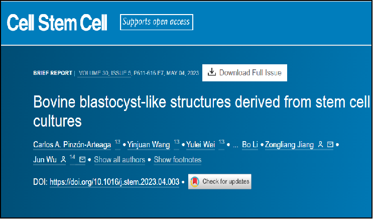 作者利用擴展?jié)撃芨杉毎妥甜B(yǎng)層干細胞構建了牛的類囊胚。模型。體外培養(yǎng)的結果表明該模型可以引發(fā)母牛對胎兒的發(fā)育識別。單細胞轉(zhuǎn)錄組的結果明確了該模型與囊胚的相似性,并利用軌跡分析解析了類囊胚譜系發(fā)育分化的路徑。