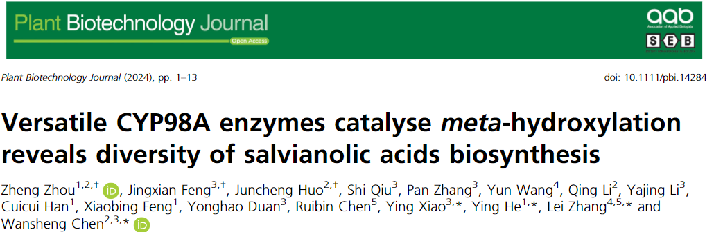 2024年1月16日,海軍軍醫(yī)大學(xué)陳萬生與張磊團(tuán)隊(duì)合作在植物學(xué)領(lǐng)域國際一流學(xué)術(shù)期刊《植物生物技術(shù)》Plant Biotechnology Journal發(fā)表一項(xiàng)最新研究成果,題為:Versatile CYP98A enzymes catalyse meta-hydroxylation reveals diversity of salvianolic acids biosynthesis。本研究以富含丹酚酸的代表性重要藥用植物丹參為研究對象,闡明了丹酚酸生物合成的多樣性,為CYP98A酶在間位羥基化反應(yīng)中催化特異性的通用性提供了新的見解,同時也證明CYP98A酶是利用代謝工程策略提高丹酚酸含量的理想操作靶點(diǎn)。中藥丹參為唇形科鼠尾草屬植物丹參(Salvia miltiorrhiza Bge.)的干燥根和根莖,是我國常用中藥。丹參藥用歷史悠久,始載于中國傳統(tǒng)醫(yī)藥學(xué)典籍《神農(nóng)本草經(jīng)》,具有祛疲止痛、活血通經(jīng)、清心除煩之功效。丹參作為復(fù)方丹參滴丸、復(fù)方丹參片、丹紅注射液等藥物的原料,廣泛應(yīng)用于心、腦血管疾病的治療,丹參藥材的年使用量超萬噸,屬于大宗常用中藥材。丹參有效成分主要包括脂溶性的丹參酮類化合物和水溶性的丹酚酸類化合物。