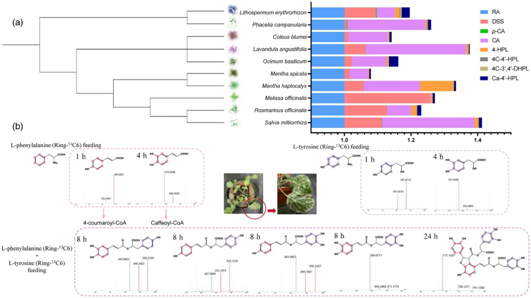 丹參中酪氨酸衍生的途徑從未被報道過,丹參素(DSS)是否參與SA生物合成仍然未知。SA的生物合成可能是多樣化的,作者在同位素標(biāo)記的喂養(yǎng)實(shí)驗(yàn)去驗(yàn)證這一結(jié)論。含有同位素標(biāo)記的 L-苯丙氨酸和 L-酪氨酸浸潤3個月大的丹參葉子中。從不同時間點(diǎn)收集的葉片中提取SA,并使用UPLC-Q-TOF/MS進(jìn)行分析。結(jié)果顯示,在p-CA、CA、4-HPL、DSS、SAB和RA及其前體(包括4C-4′-HPL、4C-3′、4′-DHPL和Ca-4′-HPL)均被檢測出標(biāo)記(圖1b)。這些結(jié)果驗(yàn)證了作者的推測,即不同的?;w,包括4C-CoA和CA-CoA以及含有4-HPL和DSS的酰基受體參與SA的形成。SA的生物合成途徑是多種多樣的。